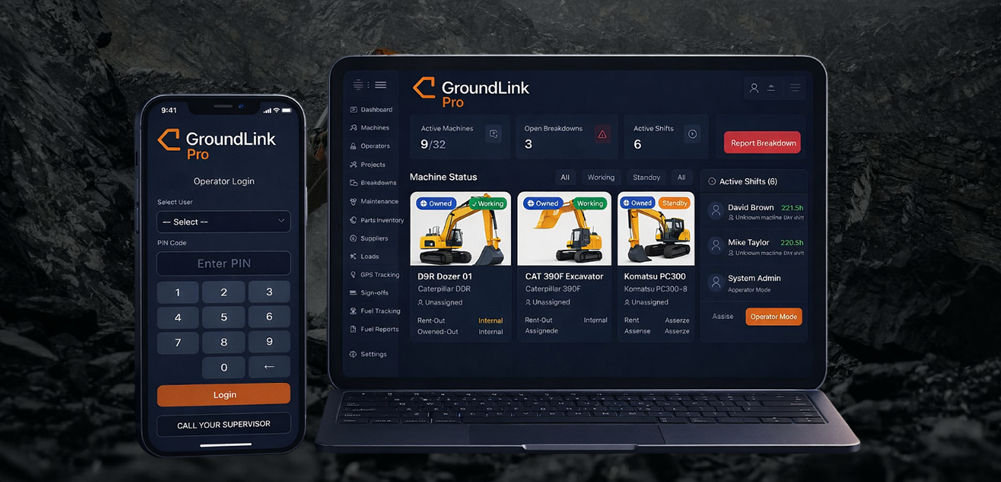 GroundLink Pro is a powerful all-in-one platform built to manage machines, operators, fuel, maintenance, GPS movement, depreciation, and true cost